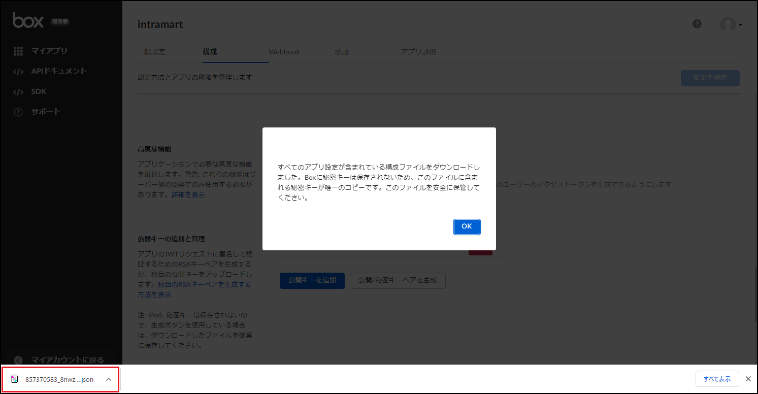 <config.json>ファイルがダウンロードされます。このファイルは後ほど使用しますので、保存してください。