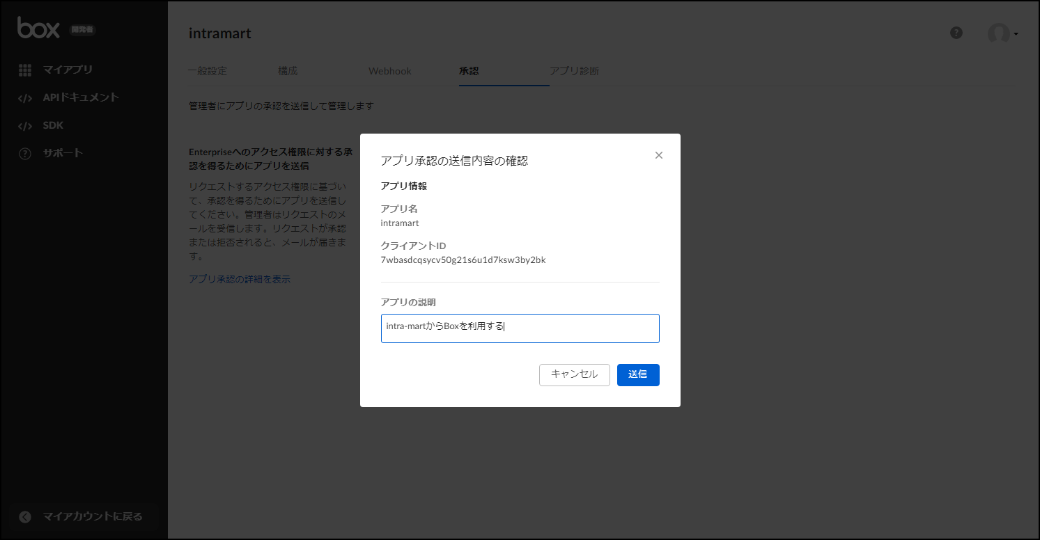 「アプリの説明」に任意の説明を入力し、「送信」ボタンをクリックします。