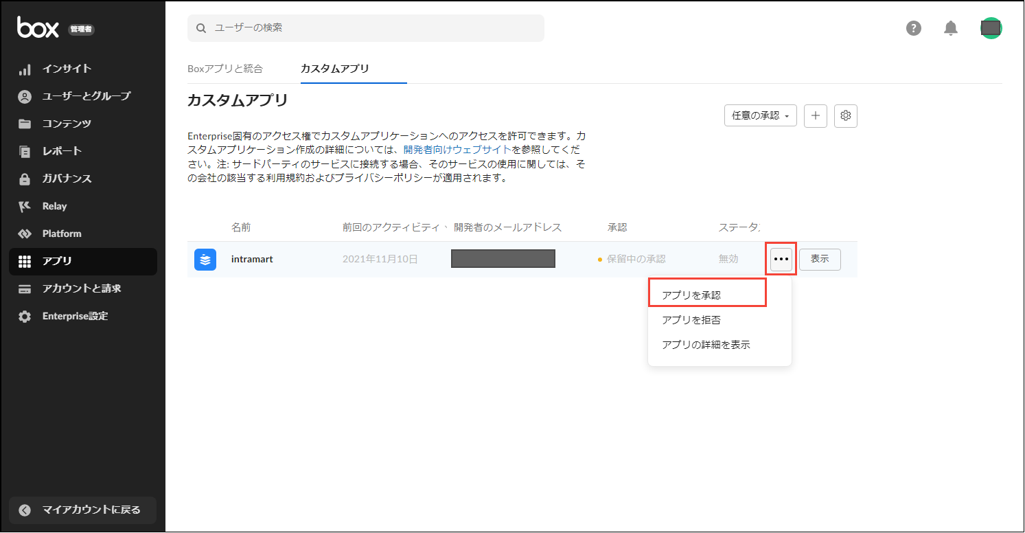 - 手順12.で送信したアプリが一覧に表示されているので、「・・・」ボタンをクリックし、「アプリを承認」をクリックします。