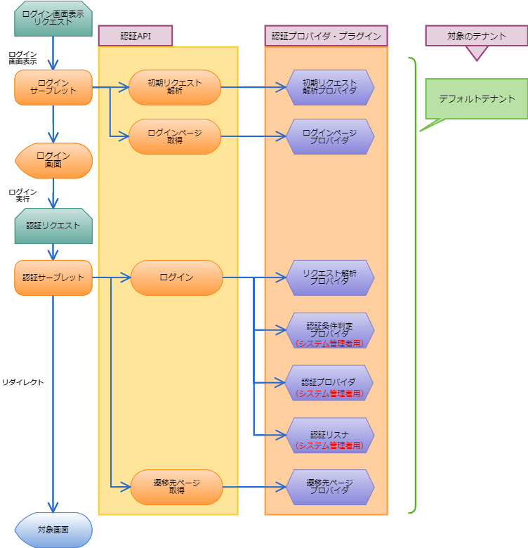 ログイン処理では、ユーザが入力したシステム管理者の情報などを利用した認証処理を行います。システム管理者の認証処理は、システム管理者の認証APIを呼び出すことで実行されます。システム管理者の認証APIと認証プロバイダ・プラグインについては、以下で説明します。システム管理者のログイン処理における、認証処理の流れは以下の通りです。