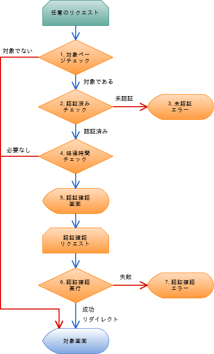 対象ページチェックは、リクエストされた画面が認証確認の対象ページかどうかを確認する処理です。認証確認の対象でないと判定された場合は、リクエストされた画面が表示されます。認証済みチェック