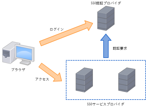 サービスを提供するシステム。認証が必要な場合、SSO認証プロバイダに認証要求を行います。SSO の構成図は以下の通りです。SSOサービスプロバイダでは、アクセスがあった場合にSSO認証プロバイダと連携して、 自動的にログイン済みの状態にします。これを「SSO自動ログイン処理」と呼びます。認証機能では、SSOサービスプロバイダでSSO自動ログイン処理を実装するためのインタフェースを提供しています。ここでは、認証機能を利用してSSO自動ログイン処理を実装するための説明をします。