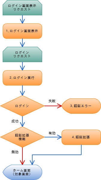 システム管理者がログインする場合のリクエストフローは、一般ユーザとほぼ同じです。ただし、システム管理者用の認証拡張機能はないため、認証拡張機能は実行されません。システム管理者のログイン処理におけるリクエストフローは、以下の通りです。このフローにおける処理の詳細は、「 システム管理者のログイン処理フロー 」を参照してください。
