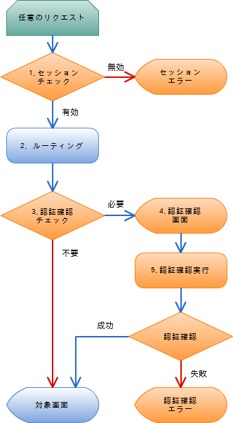 ルーティングでは、リクエストURLをもとにした処理の振り分けが行われます。ルーティング機能については、「スクリプト開発モデル プログラミングガイド」 - 「ルーティング」を参照してください。認証確認チェック
