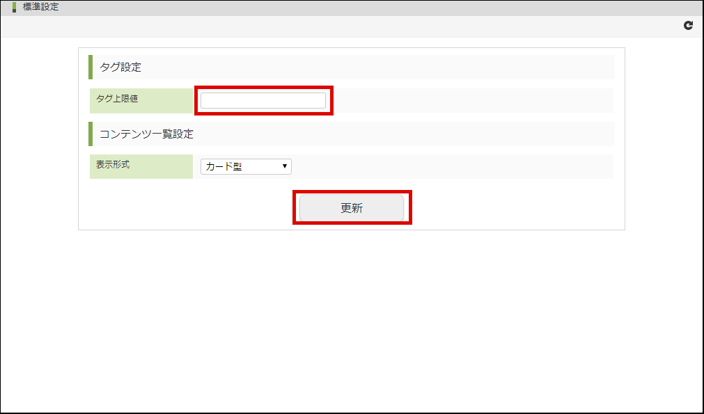 「タグの上限値」項目にタグを作成できる上限値(0以上の数値)を入力し、「更新」ボタンをクリックします。