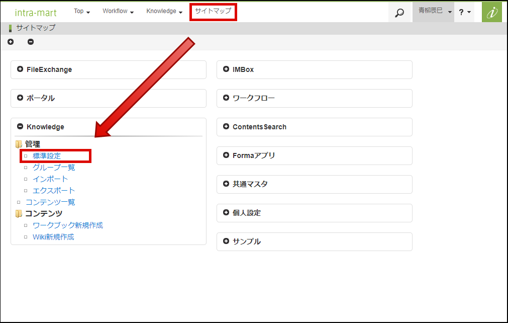 「サイトマップ」→「Knowledge」→「管理」→「標準設定」をクリックし、「標準設定」画面を表示します。