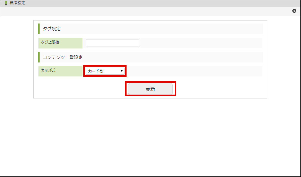 コンテンツ一覧設定の「表示形式」の項目を設定し、「更新」ボタンをクリックします。
