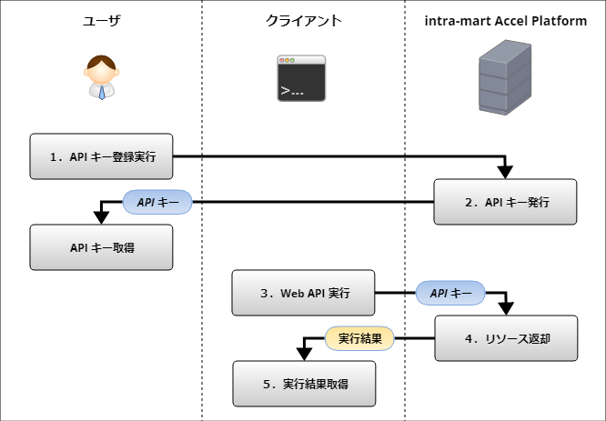 ユーザが intra-mart Accel Platform 上で API キーの登録を実行します。 intra-mart Accel Platform は API キーを登録し、登録した API キーをユーザに返却します。 クライアントはユーザから提供された API キーを用いて intra-mart Accel Platform 上の Web API を実行します。※API キーはベアラートークンとして Authorization リクエストヘッダフィールドを使用して送信します。GET /<resource_path> HTTP/1.1 Host: localhost Authorization: Bearer <api_key> intra-mart Accel Platform は API キーを検証してリソースを返却します。 Web API は取得したリソースを用いて処理を行い、結果をクライアントへ返却します。
