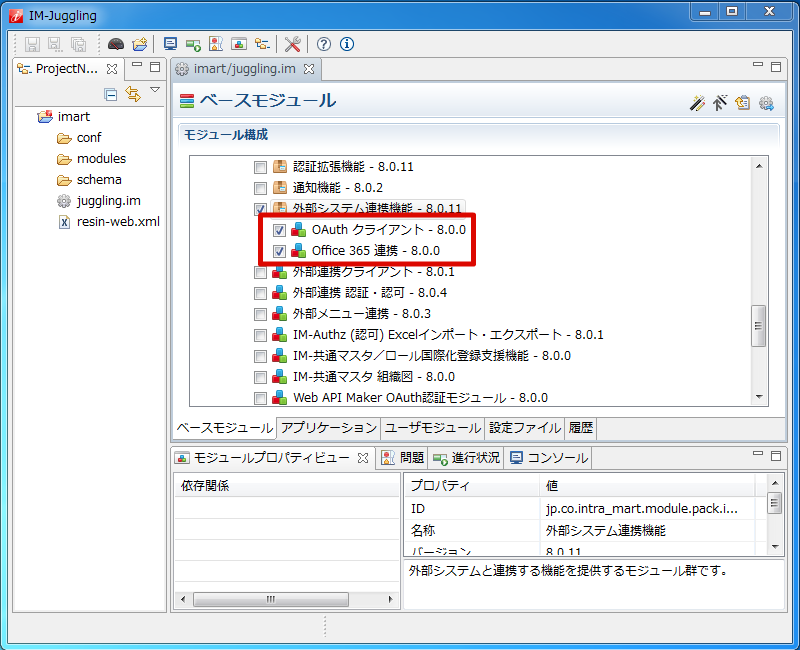 「 intra-mart Accel Platform セットアップガイド 」-「 プロジェクトの作成とモジュールの選択 」より、 Office 365 連携 , OAuth クライアント を選択します。