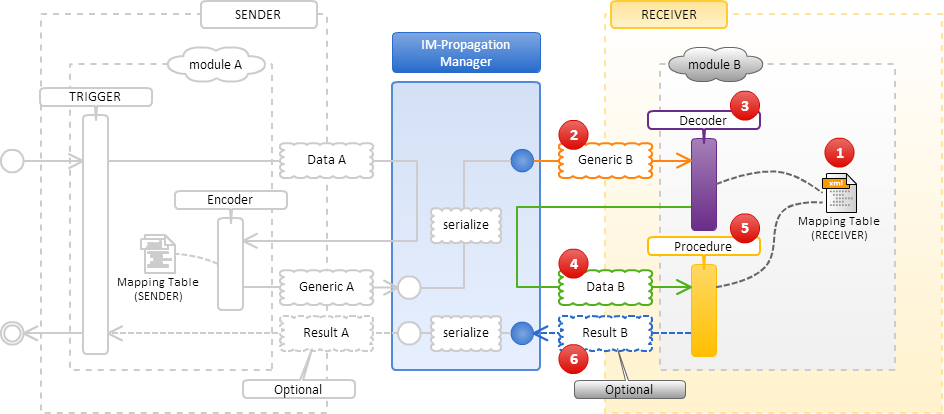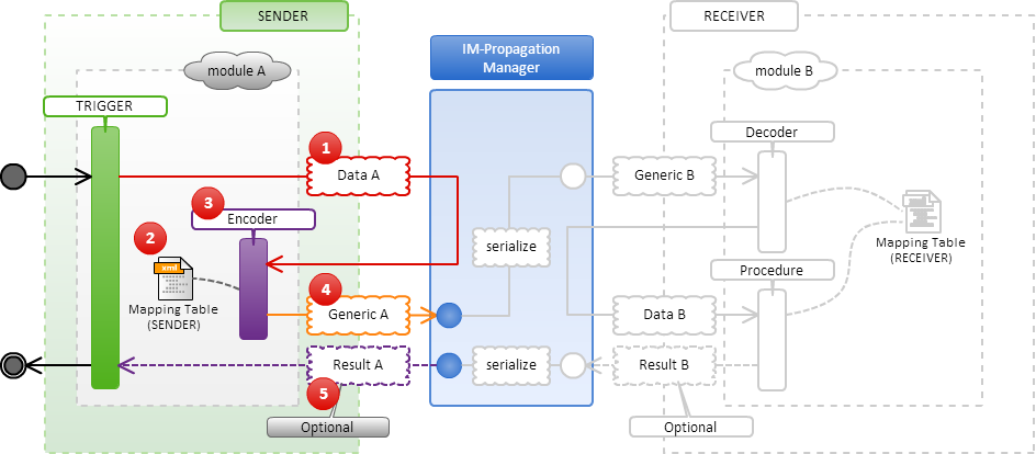 あるデータを送信しようとするモジュールA(図中の module A)がデータを格納するためのクラス (以下、独自モデル。図中の Data A)を用意して、トリガー(図中の TRIGGER)から IM-Propagation マネージャに対して対象のデータをクラス内に格納して渡します。トリガーは IM-Propagation マネージャを使用してデータ送信処理を実装しているクラスです。「独自モデル」はモジュールA側が自由に作成することができるクラスです。 データを受け取った IM-Propagation マネージャは、送られてきたデータを処理できる「送信側のデータ変換クラス(Encoder)」(図中の Encoder)をマッピング設定(図中の Mapping Table)から決定します。マッピング設定からの決定方法については、「マッピングの処理 」を参照してください。 IM-Propagation マネージャが「送信側のデータ変換クラス(Encoder)」(図中の Encoder)のインスタンスを作成し、「独自モデル」のインスタンスを渡します。 「送信側のデータ変換クラス(Encoder)」では、「独自モデル」のインスタンス内の情報を、IM-Propagation 内でデータをやりとりするための「送受信モデル(Generic)」(図中の Generic A)に変換します。「送受信モデル(Generic)」は IM-Propagation マネージャ内で処理され、受信側(図中の RECEIVER)へと渡されます。 受信側から何らかの処理結果を受け取りたい場合は、処理結果を格納するクラス(図中の Result A)を用意して、IM-Propagation マネージャにデータを送る際に、処理結果を格納するクラスを指定します。処理結果を特に受け取らない場合は、不要です。