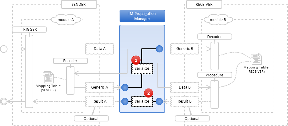 IM-Propagation マネージャでは、送信側から受け取ったデータ(図中の Generic A)を、受信側が定義するデータを格納するクラス(図中の Generic B)に変換します。送信側から受信側へデータを送信する際、内部でデータの直列化(図中の serialize)を行います。また、受信側から処理結果が返却された場合は、同様に受信側の処理結果(図中の Result B)を送信側の処理結果(図中の Result A)に変換します。詳細は「直列化(serialize)の処理 」を参照してください。