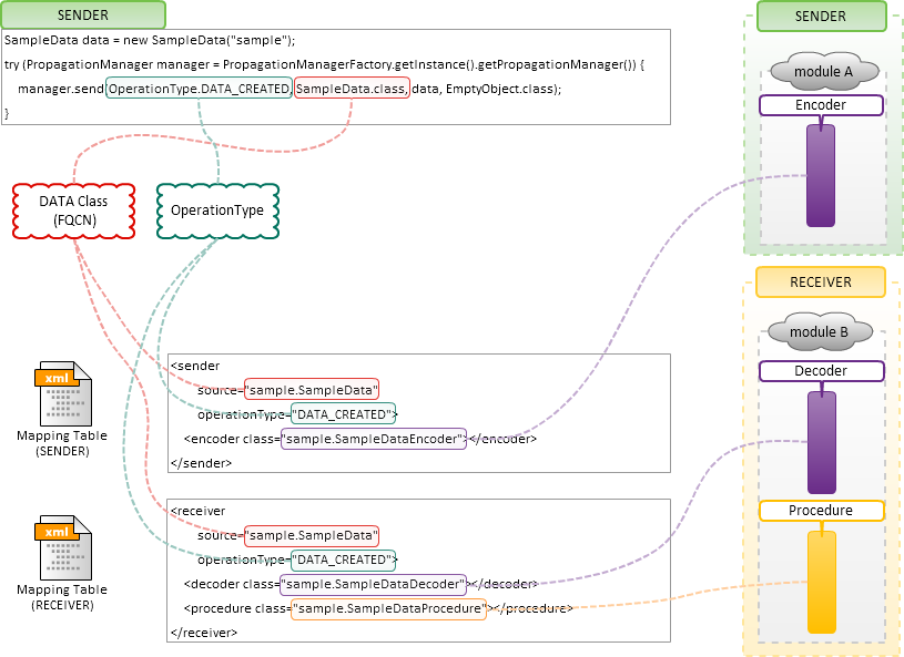 「送信側のデータ変換クラス(Encoder)」「受信側のデータ変換クラス(Decoder)」「受信側のデータ処理クラス(Procedure)」を決定するために、送信側から指定された「独自モデル」の完全修飾子(FQCN)と、「データの操作種別」をキーにして、マッピング設定から選択します。マッピング設定は、送信側と受信側でそれぞれ用意し、設定ファイル(「IM-Propagation 送信側設定」と「IM-Propagation 受信側設定」)に定義します。設定ファイルの詳細は、「設定ファイルリファレンス - IM-Propagation 送信側設定 」「設定ファイルリファレンス - IM-Propagation 受信側設定 」を参照してください。