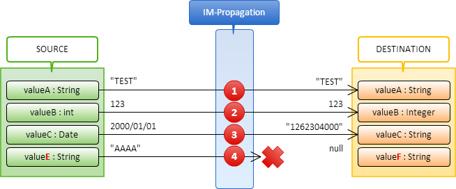 入力の型 出力の型 変換ルール byte[] java.lang.String BASE64 でエンコードした文字列に変換 java.util.Calendar java.lang.String 1970年1月1日から起算したミリ秒に変換して文字列化 java.util.Date java.lang.String 1970年1月1日から起算したミリ秒に変換して文字列化 java.lang.String 以外 java.lang.String 文字列に変換(byte[]、java.util.Calendar、java.util.Date を除く) 真偽値型 数値型 false のとき 0、true のとき 1 数値型 真偽値型 0 のとき false、それ以外のとき true 数値型 java.util.Calendar 1970年1月1日から起算したミリ秒として変換 数値型 java.util.Date 1970年1月1日から起算したミリ秒として変換 java.util.Calendar 数値型 1970年1月1日から起算したミリ秒に変換 java.util.Date 数値型 1970年1月1日から起算したミリ秒に変換 java.lang.String 真偽値型 空文字、"false"、"no"、"off"、"NaN" のとき false、それ以外のとき true java.lang.String 数値型 文字列を数値に変換 java.lang.String byte[] BASE64 でエンコードした文字列とみなしてバイナリに変換 java.lang.String java.net.URI URI とみなして変換 java.lang.String java.net.URL URL とみなして変換 java.lang.String java.util.Calendar java.text.DateFormat で変換 java.lang.String java.util.Date java.text.DateFormat で変換 java.lang.String java.util.Locale ロケールIDとみなして変換 java.lang.String java.util.TimeZone タイムゾーンIDとみなして変換 java.lang.String java.util.UUID UUID とみなして変換 配列型 配列型 出力側の配列型に変換 上表に記載されていない型変換はサポートされておらず、データ伝搬時に例外が発生する可能性があります。