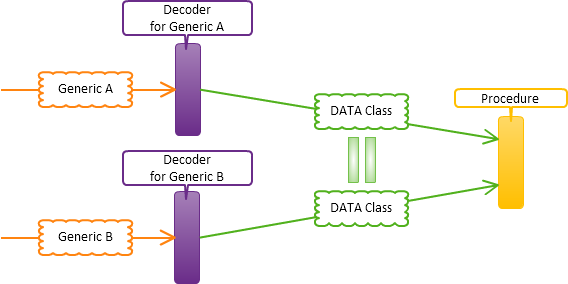 「受信側のデータ処理クラス(Procedure)」は、データの処理単位で用意します。例えば、2つの異なるモデルのデータを受け取っても最終的に同じデータ処理を行う場合、「受信側のデータ処理クラス(Procedure)」は1つだけ作成し、データ処理に最低限必要な共通の型を要求するようにします。そして、異なる「送受信モデル(Generic)」から共通の型へ変換するために、それぞれのモデルに対応した「受信側のデータ変換クラス(Decoder)」(計2つ)を用意します。これにより、データ処理が同じで3つ目のモデルに対応する場合、3つ目のモデルから共通の型へ変換する「受信側のデータ変換クラス(Decoder)」を新しく作成するだけで対応できるようになります。したがって、「受信側のデータ変換クラス(Decoder)」から「受信側のデータ処理クラス(Procedure)」に渡すクラスは、「送受信モデル(Generic)」ではなく受信側で用意した独自のクラスを渡すようにします。