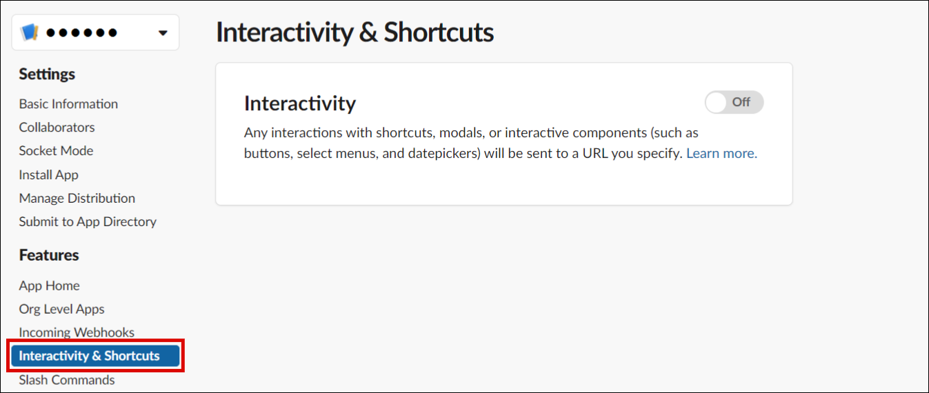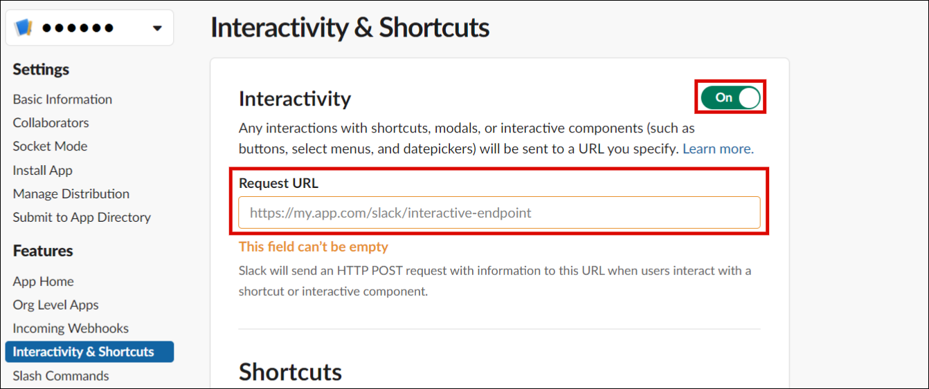 Slack app の設定画面より「Interactivity & Shortcuts」をクリックします。