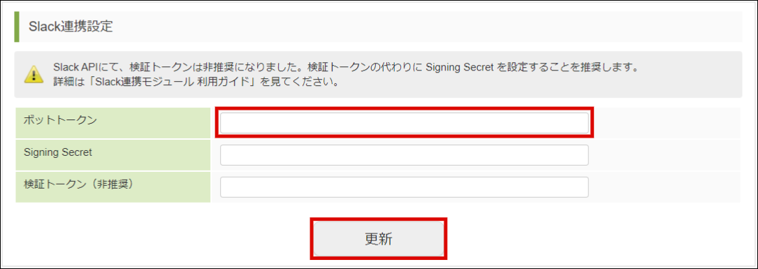 Slack の Bot User Token を「ボットトークン」に入力し「更新」ボタンをクリックします。