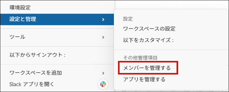 Slack ワークスペースのメニューから「設定と管理」 - 「メンバーを管理する」をクリックします。