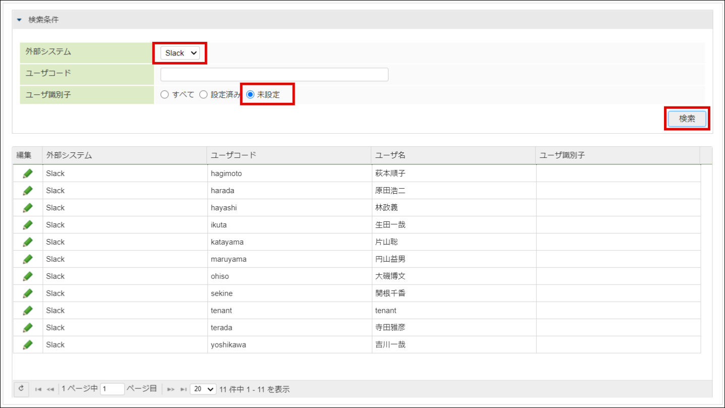 検索条件の「外部システム」に Slack 、「ユーザ識別子」に 未設定 をそれぞれ選択し、「検索」ボタンをクリックします。