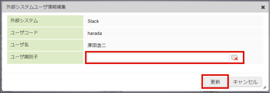 ダイアログの「ユーザ識別子」に Slack User ID を入力し、「更新」ボタンをクリックします。