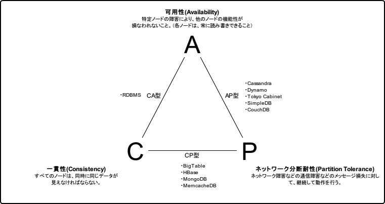 Cassandra は、ブリュワーのCAP定理のうち、AP(可用性:Availability とネットワーク分断耐性:Partition Tolerance)を重視しているため、以下のような特徴を備えています。