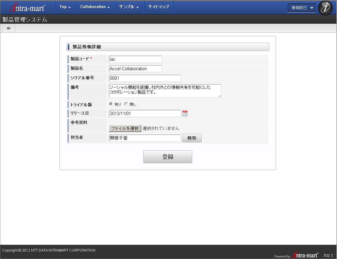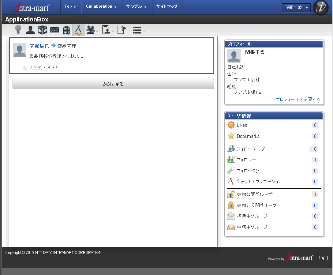 上記の処理が行われた場合、関根さん(sekine)のApplicationBoxに製品情報の登録通知が以下のように表示されます。