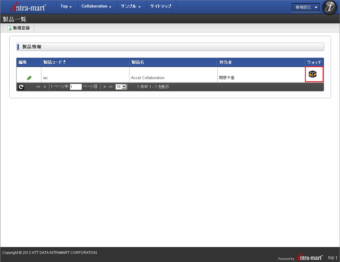 1 2 3 4 5 6 7 8 9 10 function watch(){ var applicationOperations = new imbox.ApplicationOperations(); var applicationCd = 'seihin'; var entry4Targets = []; entry4Targets.push({ targetId : 'iac', targetName : 'Accel Collaboration' }); applicationOperations.watch(applicationCd,entry4Targets); }ウォッチ情報として、以下のパラメータを設定しています。