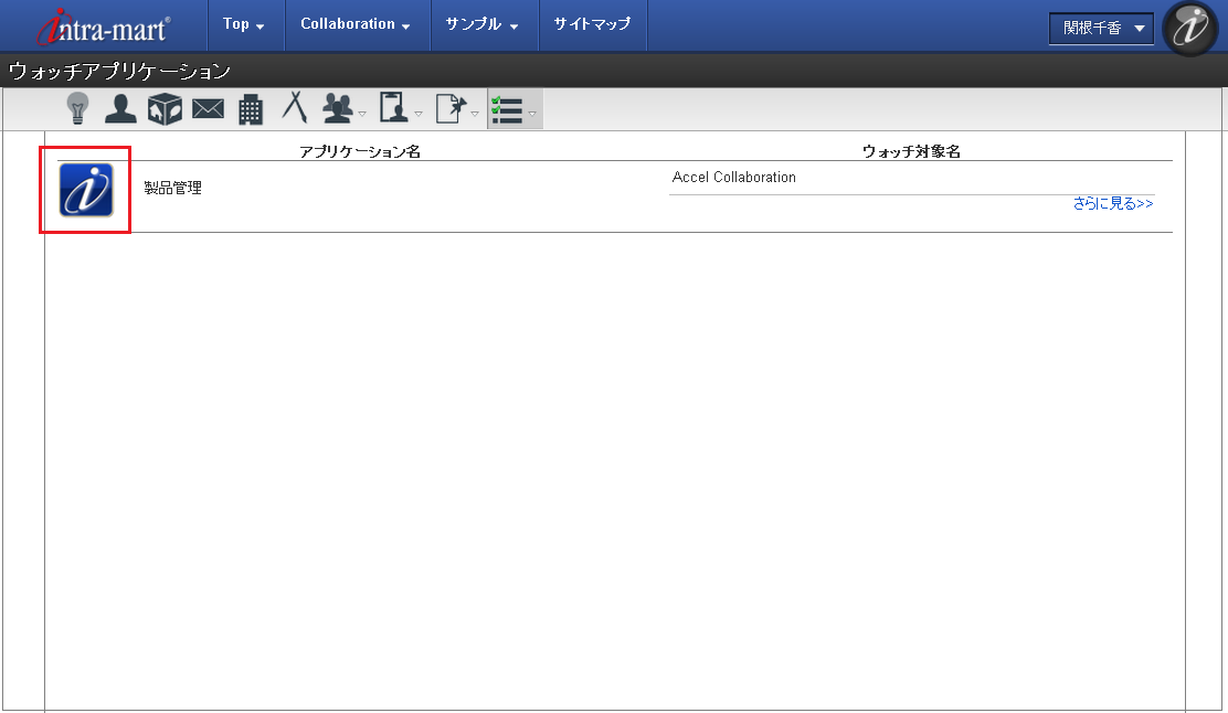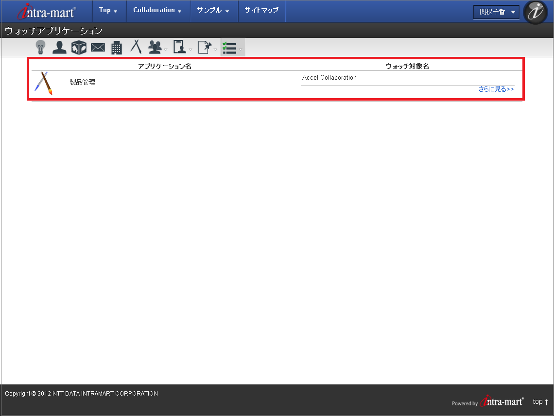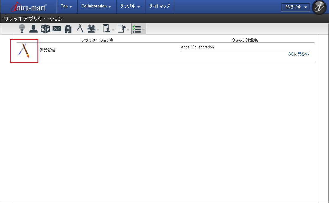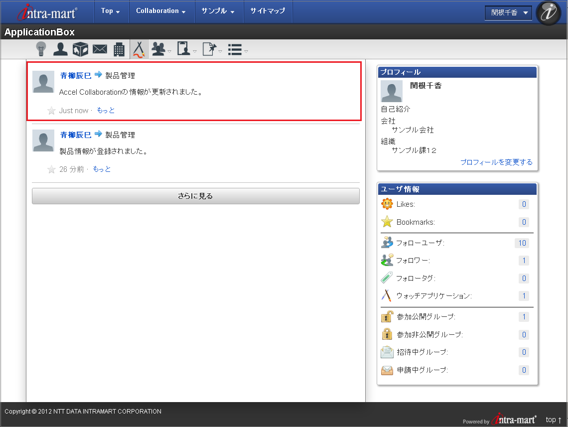 パラメータ 内容 applicationCd アプリケーションの識別ID sendUserCd 送信ユーザコード messageText 表示するメッセージ messageTypeCd メッセージ種別識別CD targetId 更新されるアプリケーション情報のID(ウォッチで使用するウォッチ対象のID) 上記の処理が行われた場合、ウォッチを行ったユーザのApplicationBoxにAccel Collaborationの更新通知が以下のように表示されます。