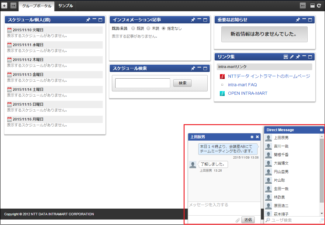 チャットとは、IMBox以外の画面でもDirectMessageBoxの機能が利用できる機能です。個人設定で表示・非表示の切り替えが可能です。個人設定に関する詳細は「 一般ユーザ操作ガイド 」-「 IMBoxの設定を行う 」を参照してください。下図「チャット」は表示例です。図 チャット