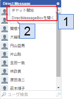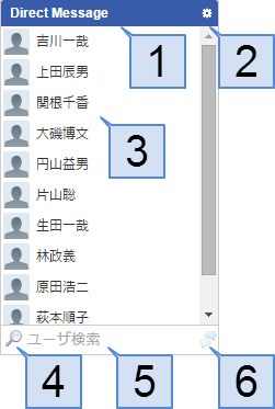 ユーザ一覧 Direct Messageの宛先を選択できます。宛先には複数のユーザを選択できます。ダブルクリックを行った場合、ダブルクリックを行ったユーザとのチャットを開始します。(複数選択不可)