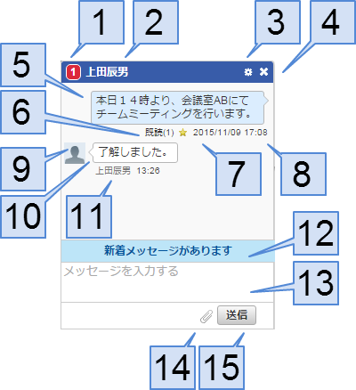 メッセージ(吹き出し左) ログインユーザ以外のユーザが投稿したメッセージを表示します。未読メッセージは黄色で表示されます。未読が解除されたメッセージは白色で表示されます。