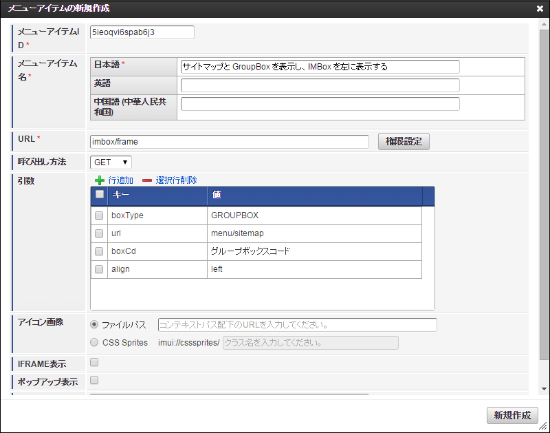 IMBoxFrame を表示するメニューに登録する例は以下の通りです。以下の例ではメニューアイテムの設定のみ記載していますが、必要に応じてメニューグループの追加や、認可の設定を行ってください。コラム