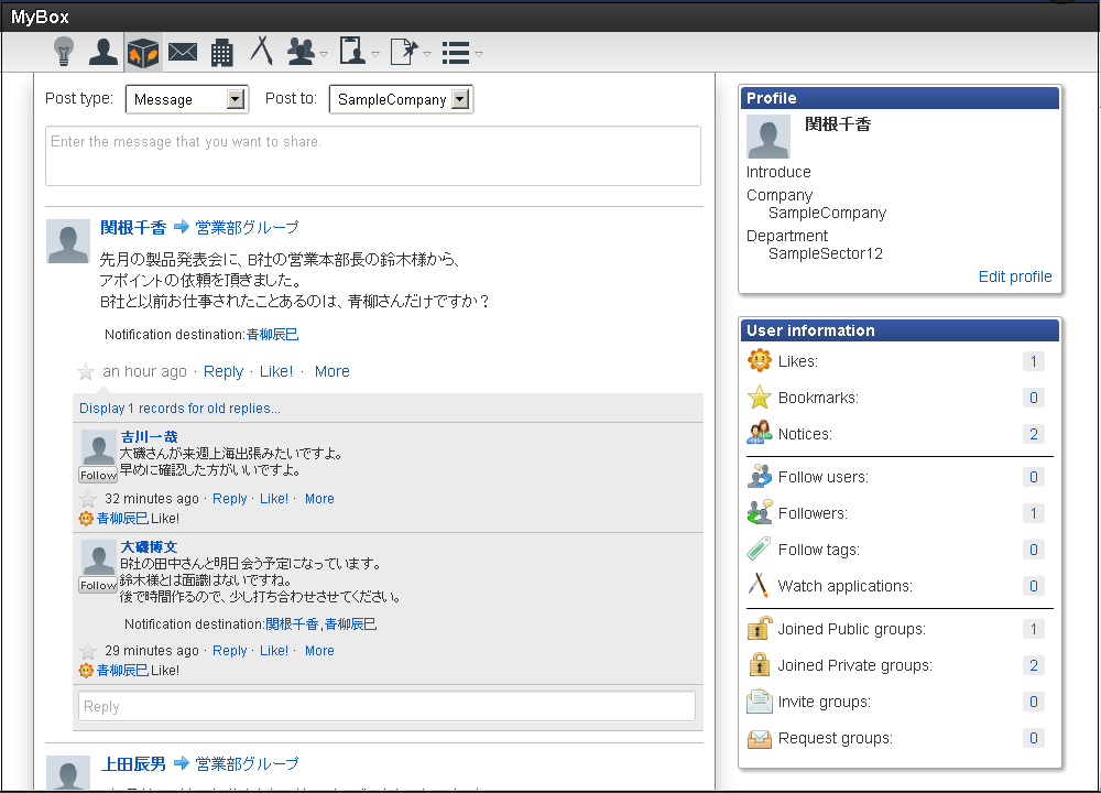 IMBoxのタイムライン、一覧の以下のデータは、ユーザ自身で変更が行えるため国際化対応されません。 ユーザ名 ユーザ自己紹介 投稿先(会社・グループ) 投稿先説明文(会社・グループ) 投稿内容 Mylist名 タグ
