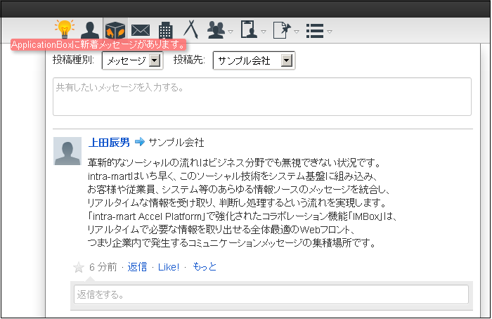 ApplicationBoxに新たな投稿があるとアプリケーション新着通知が点灯します。点灯しているアイコンをクリックするとApplicationBox画面に遷移します。ApplicationBox画面に遷移するとアプリケーション新着通知の点灯が解除されます。![]()