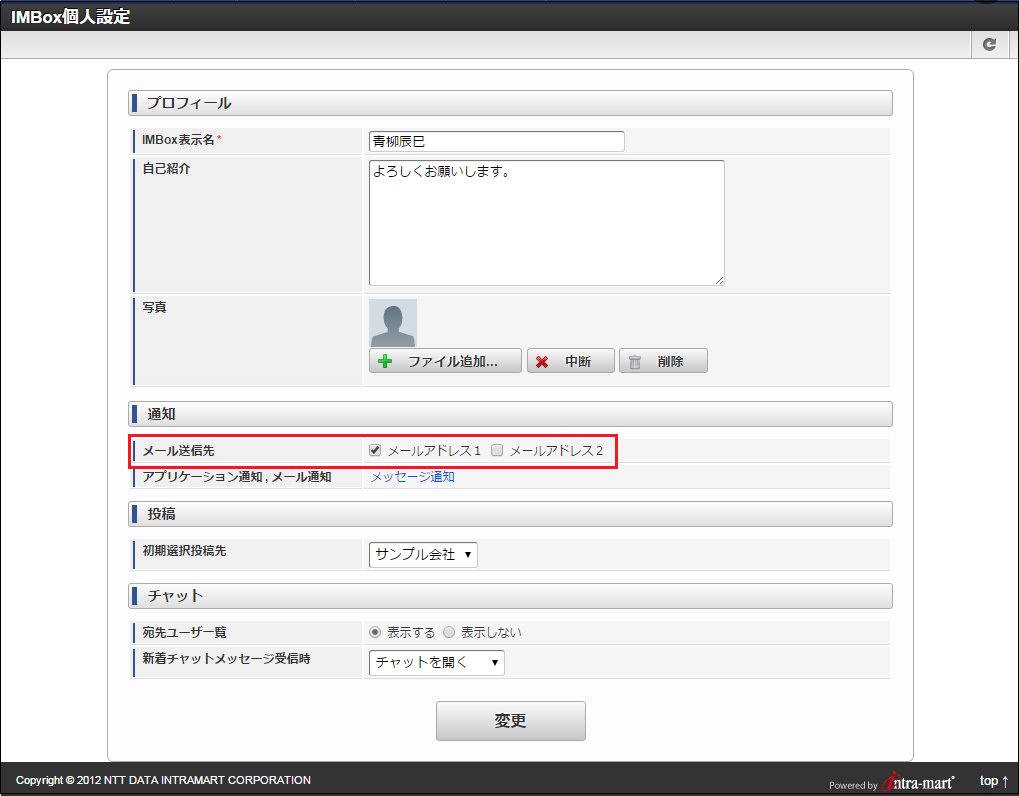 メール送信先の設定に関する詳細は「 一般ユーザ操作ガイド 」-「 IMBoxの設定を行う 」を参照してください。![]()