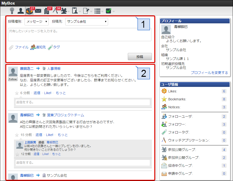自分に関連のある投稿内容を表示します。投稿内容はスレッド形式にて表示されます。表示される投稿内容は下記を参照してください。【表2. 投稿者のユーザのフォロー状態によるMyBoxの表示内容一覧表】