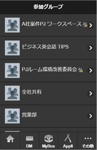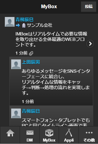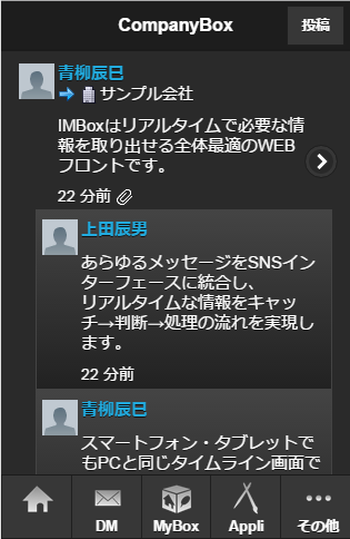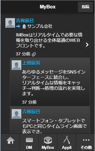 スマートフォン版では投稿を行う場合、画面右上にある投稿ボタンをタップすることにより「投稿」画面に遷移します。メッセージに添付ファイルがある場合は、クリップアイコンが表示されます。タイムラインのユーザ名をタップすると、プロフィールダイアログを表示します。タイトル部分をスライドすると、最新メッセージの取得を行います。「タップしてさらにメッセージを読み込む」をタップすると、過去に投稿されたメッセージが表示されます。
