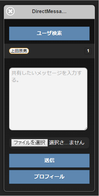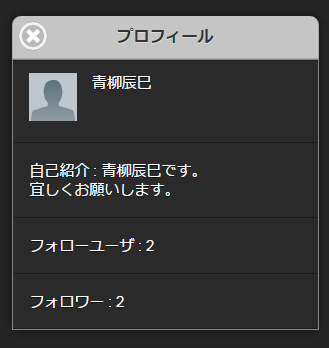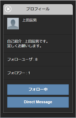 選択したユーザのユーザ情報を表示する画面です。右端のその他の中にあるプロフィール、ユーザ一覧内のユーザ名、メッセージのユーザ名をタップすると表示されます。画面左上の×ボタンをタップすると呼び出し元画面に戻ります。Direct Messageボタンをタップすると、「Direct Message投稿」画面を表示します。フォロー、フォロー解除が行えます。
