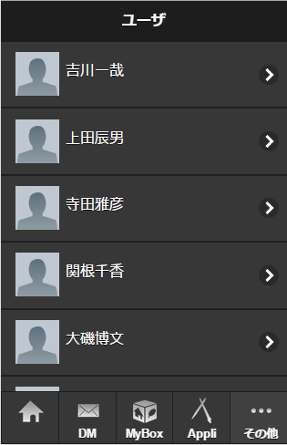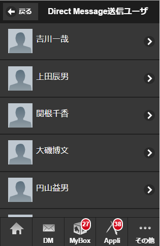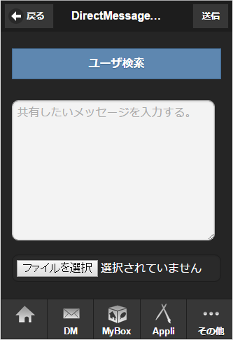 自分宛に送られたDirect Messageを表示する画面です。メニューの左から2番目にあるDMをタップすることで「DirectMessageBox」画面を表示します。メッセージをタップすると、「スレッド表示」画面に遷移します。DirectMessageBoxから、「投稿」画面に遷移した場合、ユーザ検索により宛先の選択が行えます。宛先が未選択の場合、メッセージの投稿が行えません。