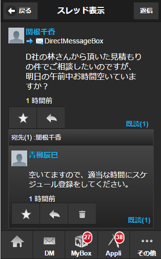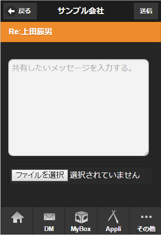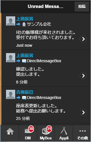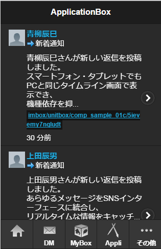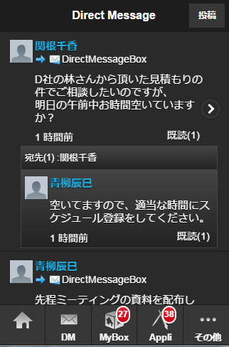 返信 : 「投稿」画面に遷移し、返信先のユーザ名が表示されます。ApplicationBoxのメッセージには表示されません。
