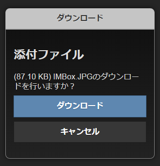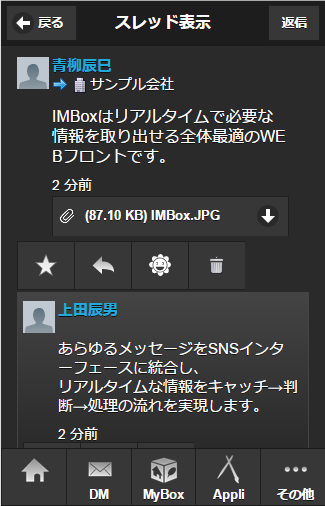選択したメッセージを、単一のスレッドのみで表示します。「スレッド表示」画面は初期表示でスレッド内すべてのメッセージを表示します。全てのタイムライン共通で返信は、「スレッド表示」画面より行います。画面左上の戻るボタンをタップすると呼び出し元画面に戻ります。返信ボタンをタップすることにより「投稿」画面に遷移します。メッセージのユーザ名をタップすると、プロフィールダイアログを表示します。メッセージに添付ファイルがある場合、添付ファイルボタンが表示されます。添付ファイルボタンをタップした場合、「ダウンロード確認」画面が表示されます。スレッドの表示件数は、imbox-config.xml に設定された件数です。(デフォルトは10件)「スレッド表示」画面ではメッセージ毎に、以下のアイコンが表示されます。