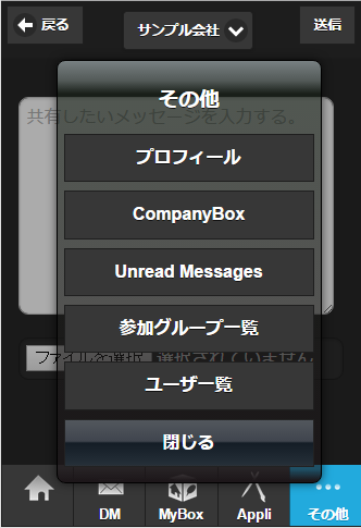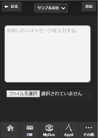 投稿先名称をタップすることにより、投稿先の変更が行われます。投稿先の初期選択は、初期選択投稿先に設定されている投稿先が選択されます。初期選択投稿先の設定については「 IMBox ユーザ操作ガイド 」-「 個人設定を編集する 」を参照してください。「ファイルを選択する」をタップすることにより、投稿内容と一緒にファイルを添付できます。添付可能なファイル数は、imbox-config.xml に設定された件数です。(デフォルトは10件)メッセージの入力後右上の投稿ボタンをタップすることにより、メッセージの送信が行われます。