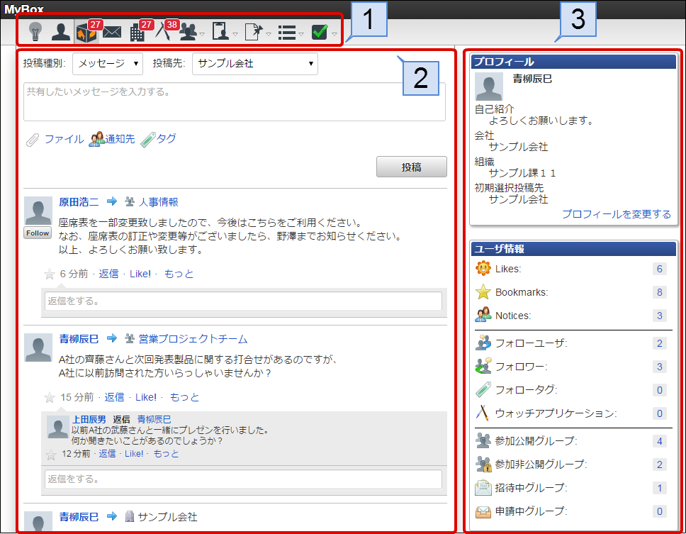 企業内で発生するコミュニケーションメッセージの集積場所となるソーシャル機能です。