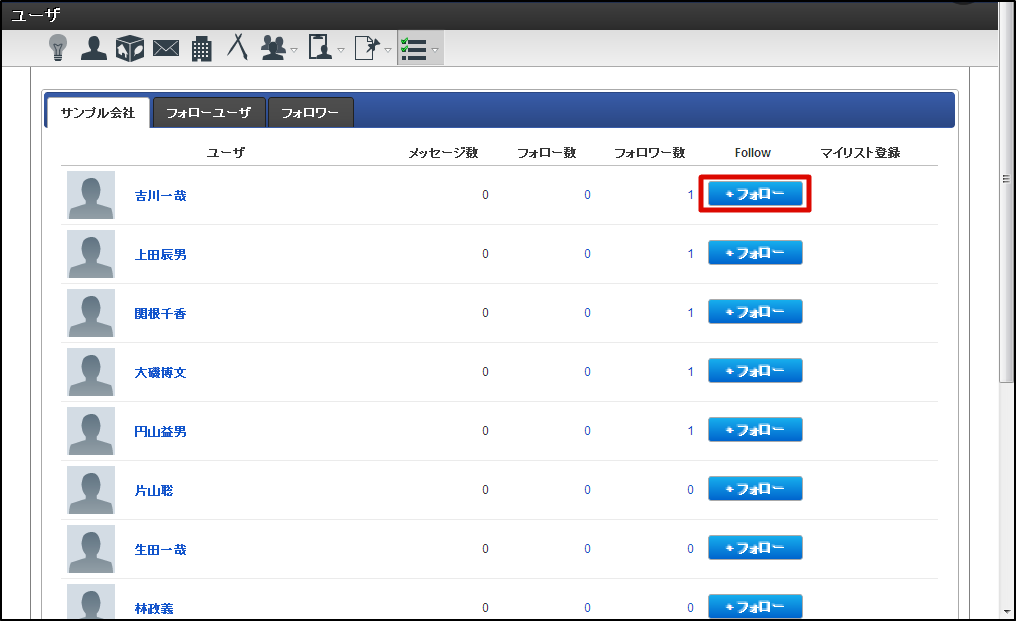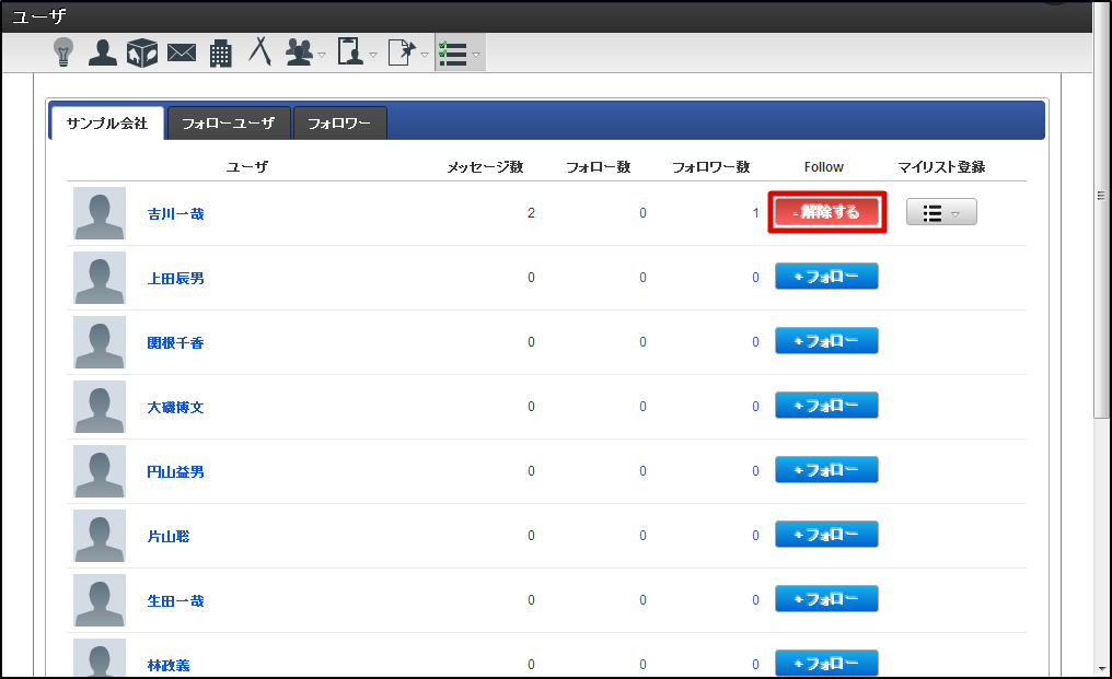IMBox メニューの「一覧」から、「ユーザ」をクリックします。 気になるユーザの「フォロー」をクリックします。 これでフォローは完了です。以後、MyBoxでフォローユーザの投稿メッセージを確認できます。 コラム フォローをやめたい場合は、「フォロー中」にカーソルを合わせてください。 「解除する」に名前が変わりますので、クリックしてください。