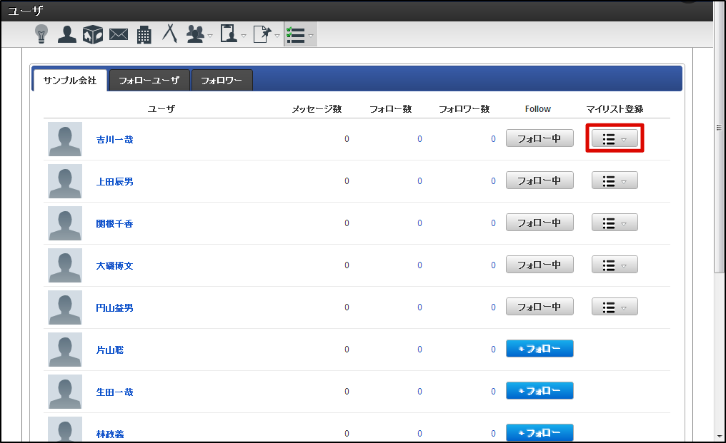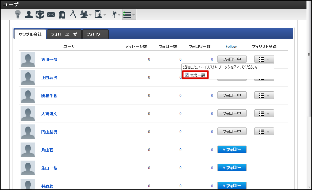 IMBox メニューの「一覧」から、「ユーザ」をクリックします。 マイリストに追加したいユーザの「マイリスト登録」をクリックします。 追加したいマイリストのチェックボックスをオンにします。 これでマイリストへの追加は完了です。以後、マイリストで登録したユーザの投稿メッセージを確認できます。