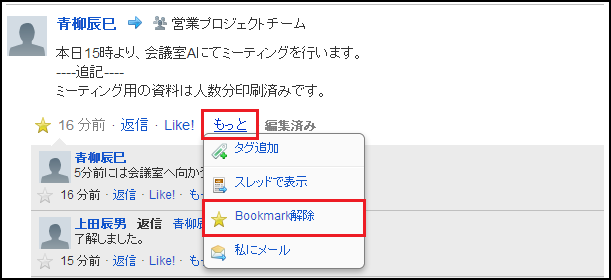 「もっと」メニューからBookmarkを解除することも可能です。