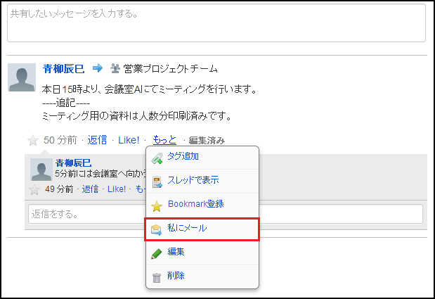 メッセージの「もっと」メニューにある「私にメール」をクリックすると、設定しているメールアドレスにそのメッセージを送信することができます。