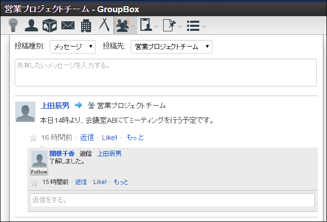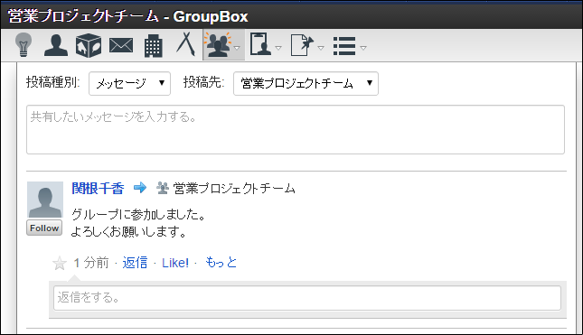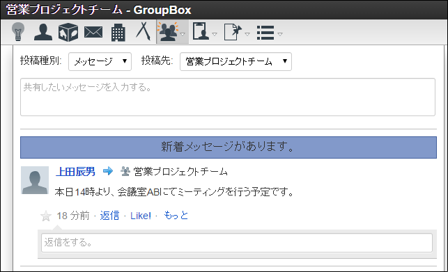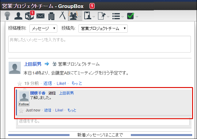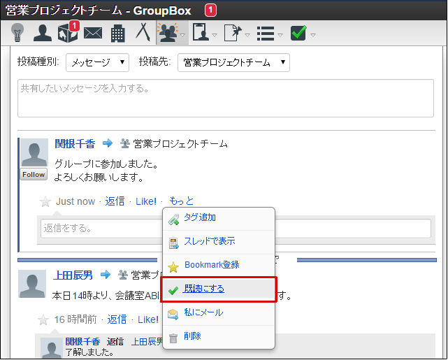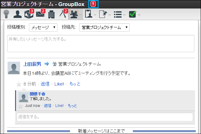 新着通知バーをクリックし、新着メッセージを表示します。GroupBoxの未読件数はタイトル上から確認できます。これで、GroupBoxの未読件数を確認することができました。