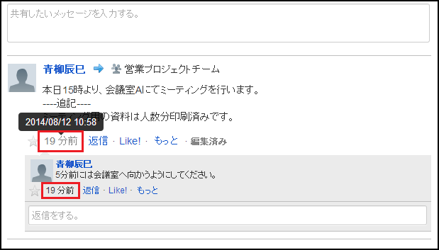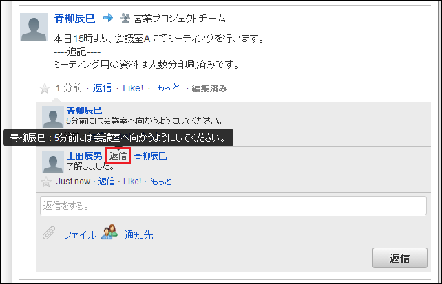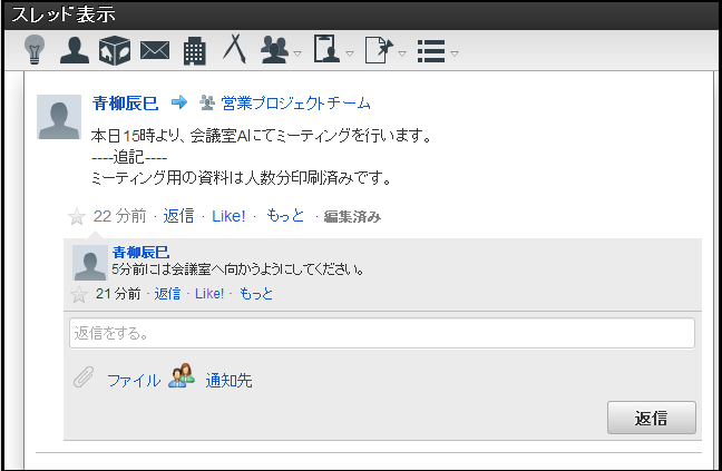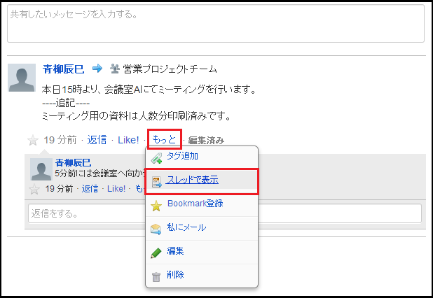 メッセージの「もっと」メニューから、「スレッドで表示」をクリックします。 メッセージをスレッドで表示することができました。 コラム 「投稿日時」をクリックすることでも、スレッドで表示することが可能です。 また、返信先を指定した際の「返信」をクリックすることでも、スレッドで表示することが可能です。