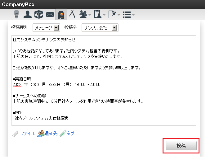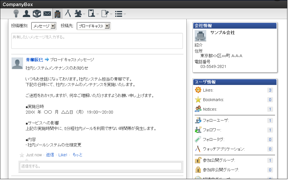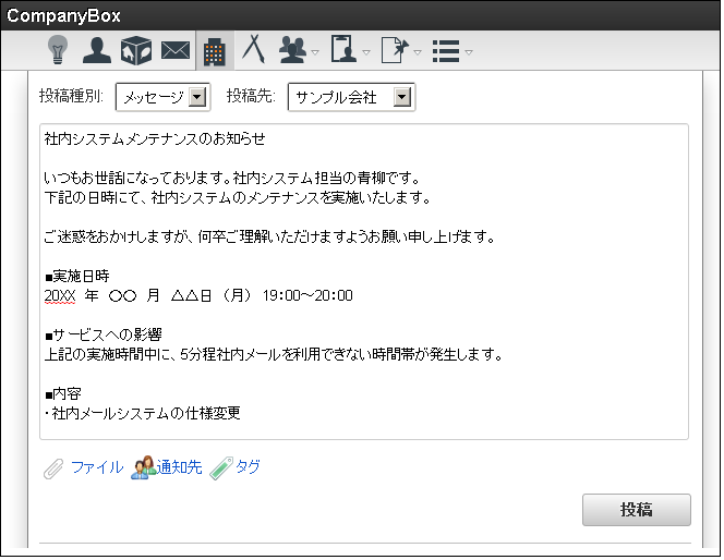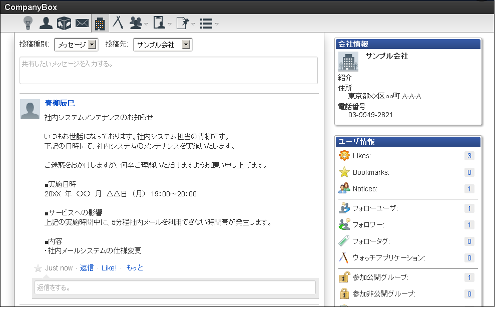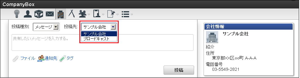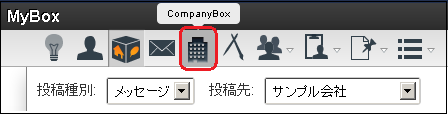 IMBox メニューのCompanyBoxをクリックします。 自社の名前を選択します。(初期状態は自社です) メッセージを入力します。 「投稿」をクリックします。 自社に向けて、メッセージを投稿することができました。