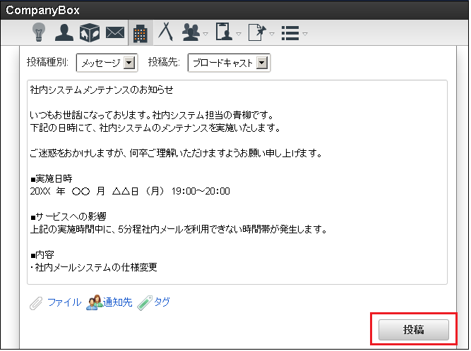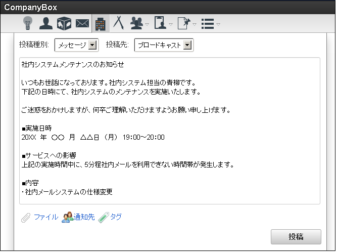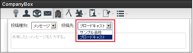 IMBox メニューのCompanyBoxをクリックします。 「ブロードキャスト」を選択します。(初期状態は自社です) 注意 ブロードキャストメッセージを投稿する権限を許可されていない場合は「ブロードキャスト」を選択することができません。 メッセージを入力します。 「投稿」をクリックします。 関連会社全てに向けて、メッセージを投稿することができました。